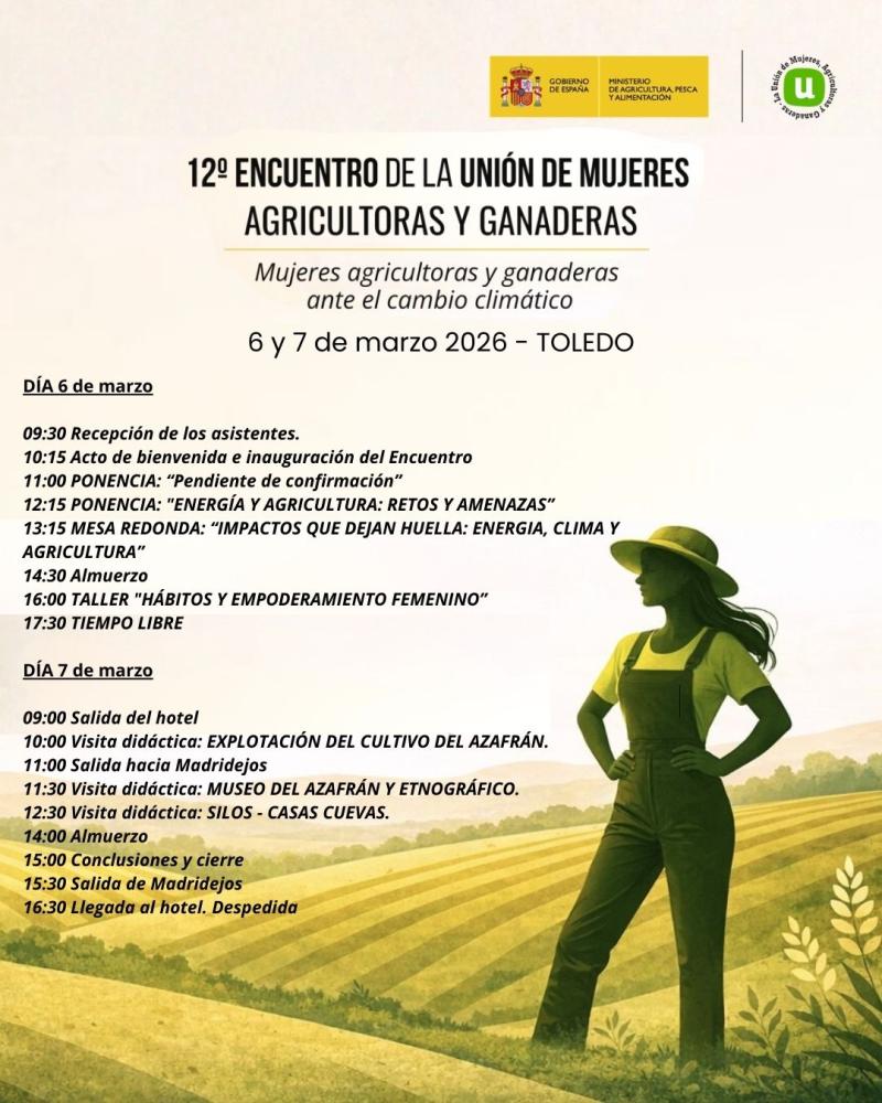La Unión de Mujeres, Agricultoras y Ganaderas celebra su 12º Encuentro Nacional “MUJERES AGRICULTORAS Y GANADERAS ANTE EL CAMBIO CLIMATICO” los días 6 y 7 de marzo en Toledo, haciéndolo coincidir con el día internacional de la mujer, con el objetivo de favorecer un espacio abierto para el conocimiento, el aprendizaje y el debate en torno al protagonismo de las mujeres del medio rural. El encuentro se ha organizado en 2 jornadas: