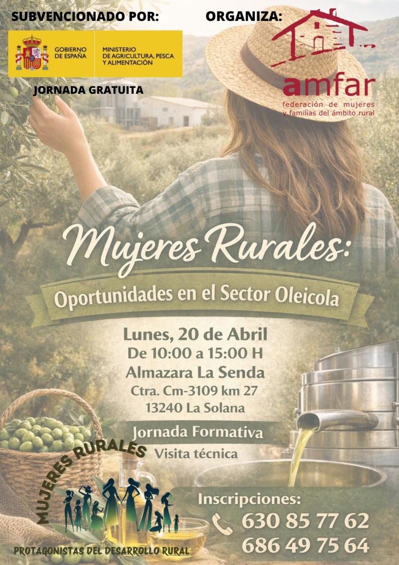 En el marco de este programa, AMFAR organiza la jornada: “MUJERES RURALES: OPORTUNIDADES EN EL SECTOR OLEICOLA”, que tendrá lugar el próximo lunes 20 de Abril de 2026 en las instalaciones de Almazara la Senda, La Solana, Ciudad Real.
